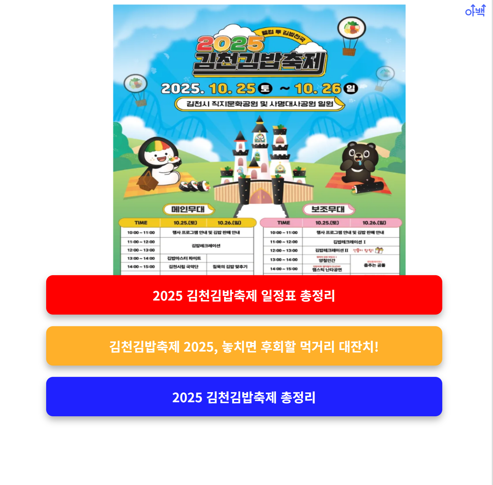 10월 마지막 주말, 경상북도 김천이 김밥으로 가득 찹니다! 🍙 바로 2025 김천김밥축제가 10월 25일(토)부터 26일(일)까지 양일간, 직지문화공원과 사명대사공원 일원에서 성대하게 열립니다. 가을 나들이, 가족 여행, 데이트 코스로 완벽한 축제! 메인무대, 보조무대 공연 시간표까지 지금 확인하세요!