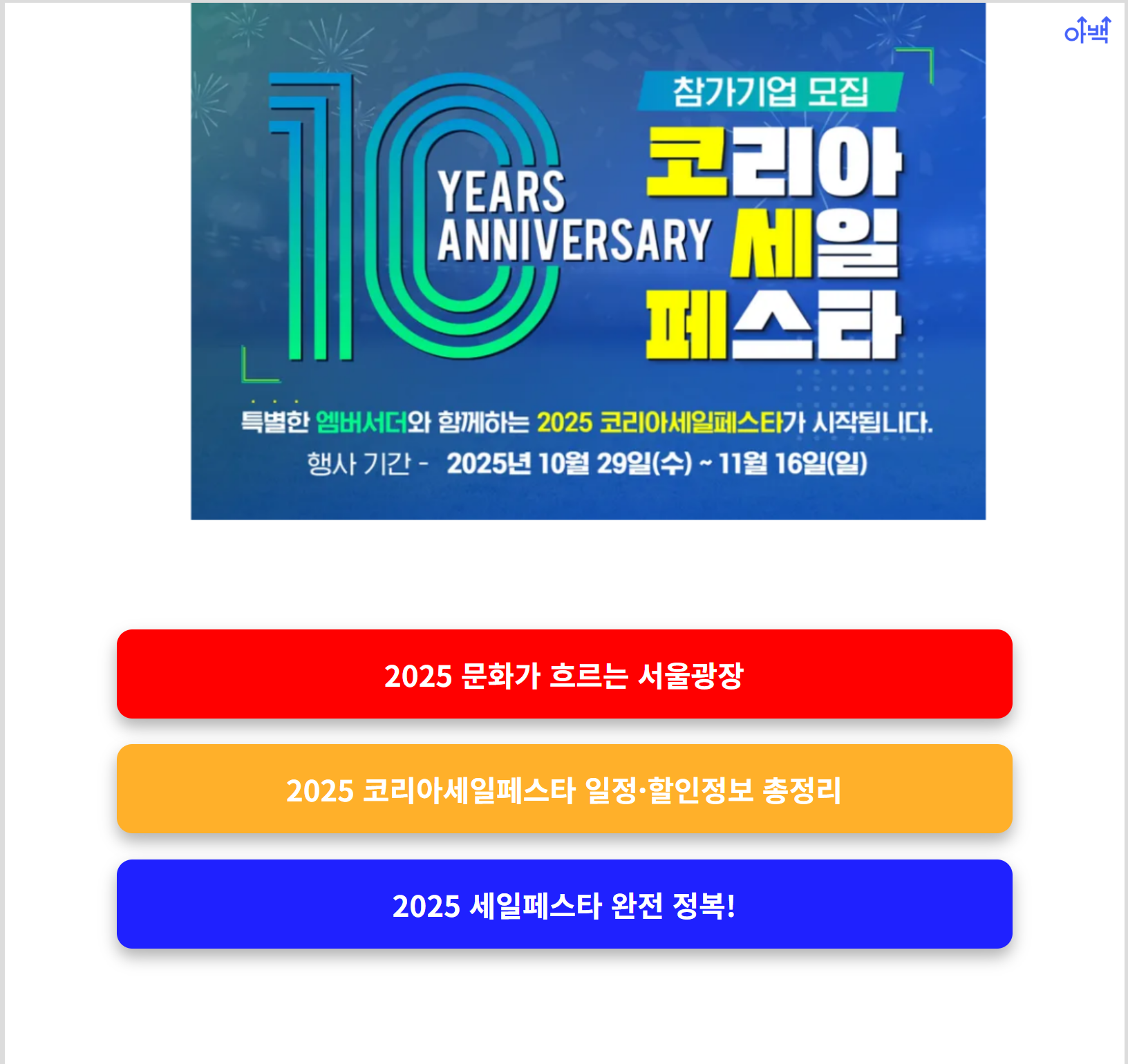 | 코리아세일페스타 | 10월 말 ~ 11월 중순 | 브랜드 총출동 할인 | 가전, 패션, 식품 |