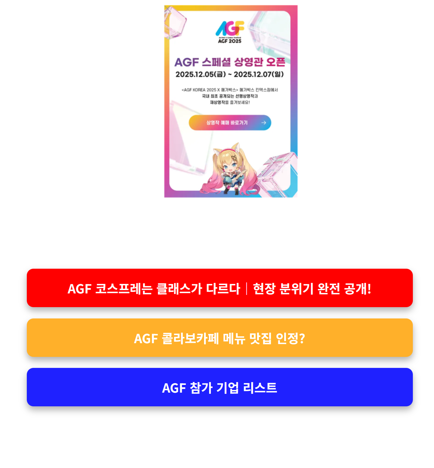 애니, 게임, 버츄얼 유튜버 팬이라면 절대 놓치면 안 되는 **AGF 2025(Anime x Game Festival)**, 올해는 규모부터 콘텐츠까지 역대급입니다. 입장 전 필수로 알고 가야 할 꿀팁들을 지금부터 소개합니다.